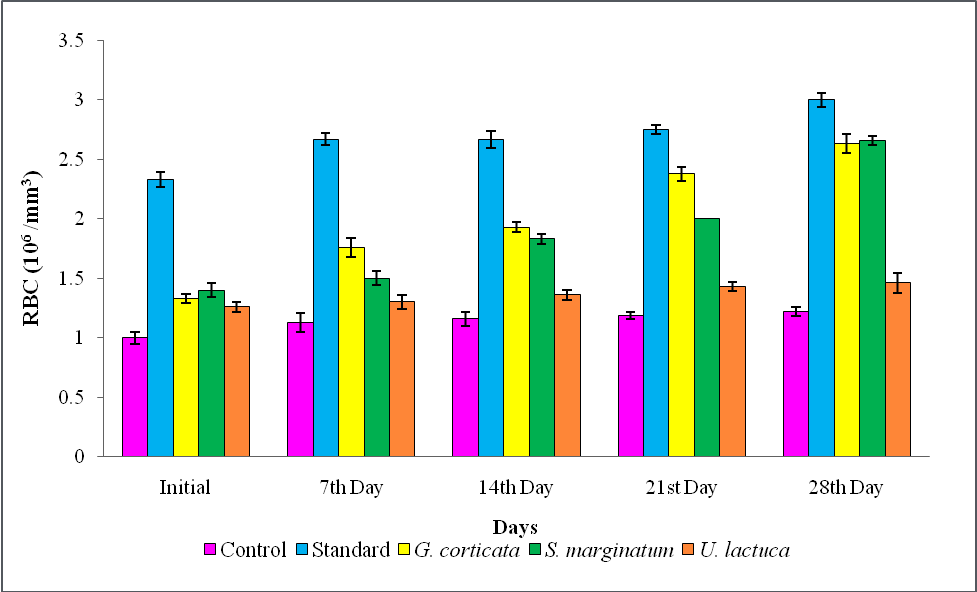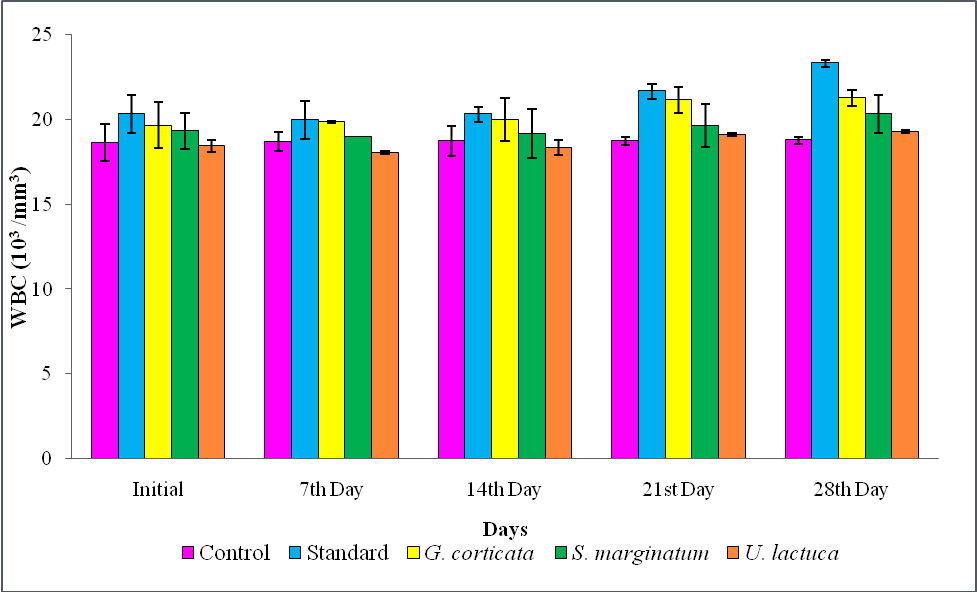 There was a gradual increase in the RBC count (fig. 1) from the initial day to the 28th day the maximum being observed in the fishes injected ciprofloxacin drug (as standard) on 28th day (3±0.06)×106 cells/mm3 followed by Stocheospermum marginatum extract on the 28th day (2.66±0.04)×106 cells/mm3 Gracilaria corticata (2.63±0.08)×106 cells/mm3 and Ulva lactuca (1.46±0.08)×106 cells/mm3 and the control phosphate buffer saline had least amount of RBC was counted (1.22±0.04)×106 cells/mm3. Then WBC level also gradually increased from initial day to 28th day the values being high for the standard ciprofloxacin (23.33±0.22)×103cells/mm3. The red seaweed Gracilaria corticata a value of (21.3±0.47) ×103cells/mm3 was noted and the brown seaweed Stocheospermum marginatum recorded a value of (20.33±1.11)×103cells/mm3 the green seaweed Ulva lactuca value was (19.3±0.06)×103 cells/mm3. The least level was found in control drug (18.78±0.22) ×103 cells/mm3. Haemoglobin count was more at 28th day (6.33±0.04) g % in the fishes injected with ciprofloxacin. There was a steady rise in the value from the initial day to 28th day. In Gracilaria corticata the haemoglobin level was (5.66±0.08) g % which was close to the standard group. Stocheospermum marginatum and Ulva lactuca had the haemoglobin (5.03±0.06) g % and (5±0.05) g % on 28th day. The least haemoglobin was found in the control group on 28th day (3.5±0.08) g %. The haematocrit values also increased from initial day to 28th day. The least haematocrit value was noted in control group (17.45±0.44)% on 28th day. The most value was found in the standard group in 28th day (20.17±0.66)%. The red, brown and green seaweeds had the following haematocrit values (19.33±0.44)%, (18.5±0.08)% and (18.66±0.44)% on 28th day.