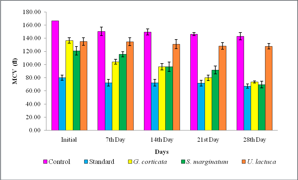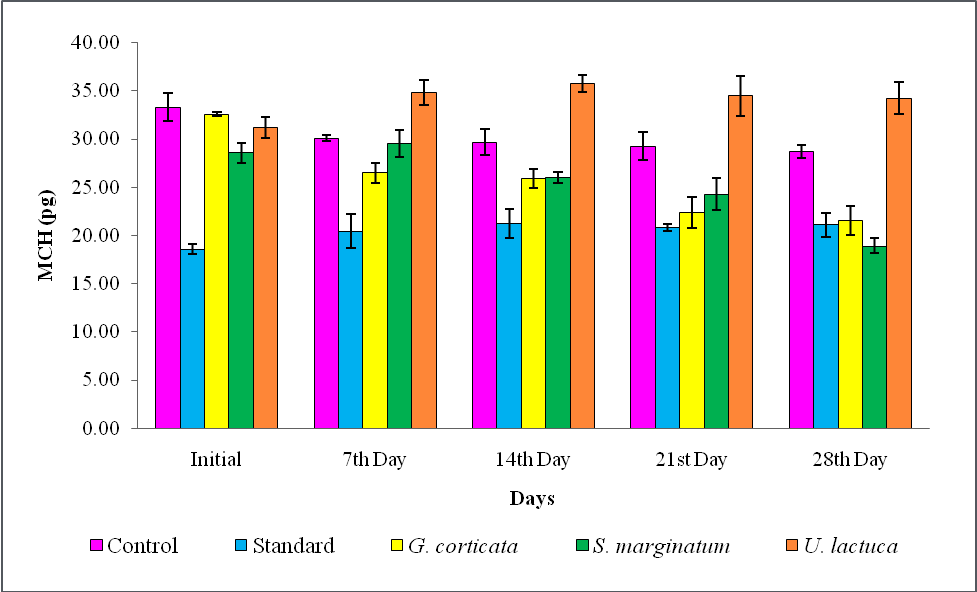 The Mean corpuscular volume (MCV) was decreased from initial day to 28th day. The highest value of MCV was found in control group on 28th day (143.03±5.55) fl. And the lowest value was found in a Standard group on 28th day (67.23±3.33) fl. Gracilaria corticata had (73.50±1.48) fl on 28th day the brown seaweed Stocheospermum marginatum had (69.55±5.18) fl on 28th day and Ulva lactuca had (127.81±4.31) fl on 28th day. Similarly, the Mean Corpuscular Haemoglobin () value also decreases from initial to 28th day. The lowest MCH Value was found in Stocheospermum marginatum on 28th day (18.91±0.79) pg and the highest value was noted in Ulva lactuca on 28th day (34.25±1.66) pg. the standard group contain (21.10±1.22) pg on 28th day. The red seaweed Gracilaria corticata had (21.52±1.48) pg on 28th day the control group was noted (28.69±0.66) pg on 28th day. The Mean corpuscular Haemoglobin Concentration (MCHC) value increased from initial to 28th day. The most value of MCHC was found in 28th day (31.38±1.37) g/l in the standard group and least value of MCHC was found on 28th day (20.06±1.28) g/l in control group. The MCHC value of Gracilaria corticata was recorded in 28th day (29.28±1.15) g/l. In Stocheospermum marginatum the MCHC value was found in (27.19±1.62) g/l on 28th day. The Ulva lactuca had a MCHC value of (26.80±2) g/l on 28th d.