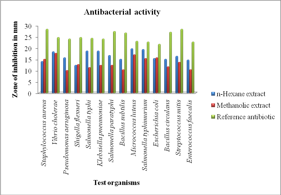 The in vitro antibacterial screening was carried out against selected four gram-positive, eight gram-negative and two gram-variable bacterial pathogens causing various diseases in human. The bacterial pathogens were Staphylococcus aureus (MTCC-1430), Vibrio cholerae (MTCC-3906), Pseudomonas aeruginosa (MTCC-1035), Shigella flexneri (MTCC-95430), Salmonella typhi (MTCC-733), Klebsiella pneumoniae (MTCC-109), Salmonella paratyphi (MTCC-3220), Bacillus subtilis (MTCC-1305), Micrococcus luteus (MTCC-1809), Salmonella typhimurium (MTCC-98), Escherichia coli (MTCC-614), Bacillus circulans (MTCC-490), Streptococcus mitis (MTCC-2897), Enterococcus faecalis (MTCC-459). These species were procured from Microbial Type Culture Collection Centre (MTCC) and Gene Bank, Chandigarh, India. The remaining bacterial species were procured from Post Graduate Department of Microbiology, OUAT, Bhubaneswar, Odisha. These organisms were identified by standard microbial methods [14]. The antibacterial screening of the extracts was carried out by determining the zone of inhibition using agar well diffusion method [13] for bacteria.
