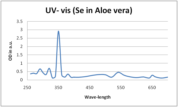 In order to determine the formation of Selenium nanoparticles in the extract of Aloe vera, a spectral scanning procedure was carried out from 250 nm to 700 nm. Colloidal solution exhibited absorption maxima at 350 nm (fig. 2).