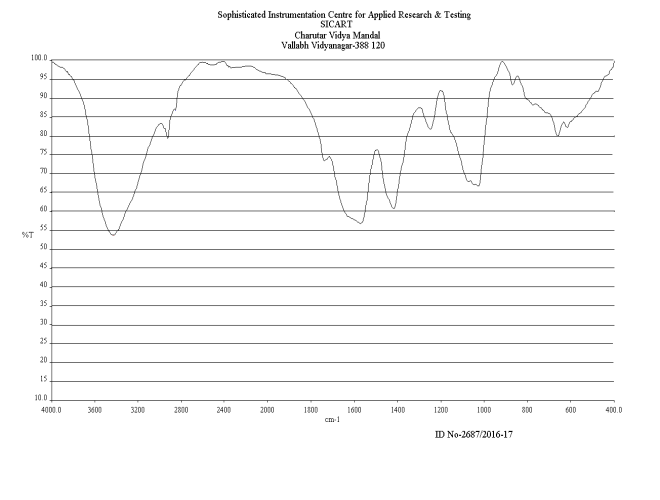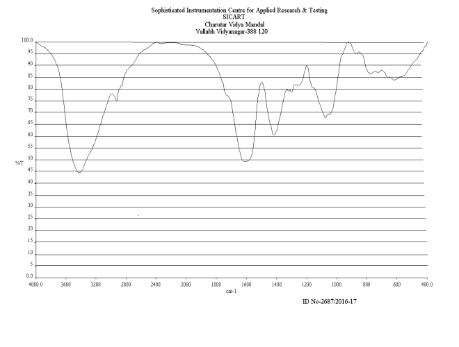 Metal containing Aloe vera extract for Fourier Transform Infrared (FT-IR) analysis was prepared by mixing 5 mg metal salt in 10 ml plant extract. This metal containing plant extract was incubated at room temperature for 1 h. After 1 h incubation, this metal containing leaf extract was dried in Petri plate. After drying, particles were scraped using blade. So, powder of synthesized nanoparticles was obtained. Then spectral scan analysis was carried out at wave number ranging from 400-4000 cm-1 by using a FT-IR spectrometer (Perkin Elmer, Spectrum GX) with resolution of 0.15 cm-1 to evaluate functional groups that might be involved in sorption process [11].