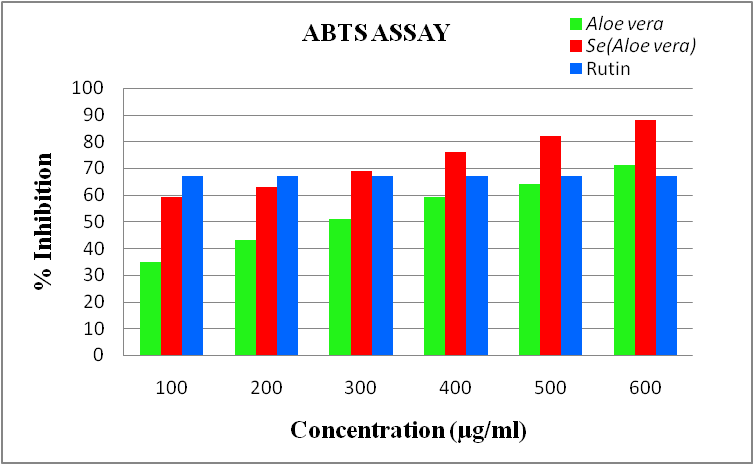 For ABTS assay, the procedure followed the method of [16] with some modifications. The percent inhibition of ABTS radical by plant extracts were determined by the ability of plant extracts to scavenge the cationic free radical ABTS. Different concentrations (100 to 600 μg/ml) of Aloe vera extract and the biogenic synthesized Se nanoparticles were separately mixed with 3 ml of 0.1 mmol ABTS and incubated in dark for 15 min. The extent of decolorization was measured at 745 nm. Rutin was used as standard and ABTS reagent without sample was used as control solution. The percent of scavenging inhibition capacity of ABTS+ of the extract was calculated from the following equation: