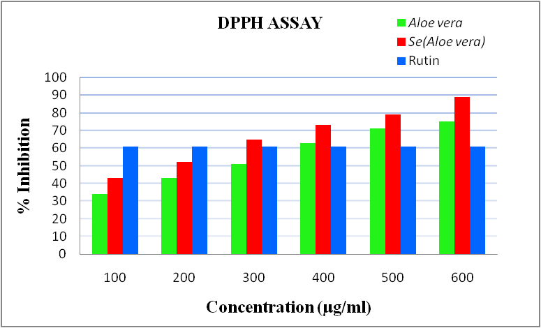 Antioxidants are compounds that prevent the oxidation of essential biological macromolecules by inhibiting the propagation of the oxidizing chain reaction. The reducing power of compounds is directly proportional to antioxidant activity of biogenic synthesized selenium nanoparticles was assessed by DPPH scavenging assay by using Rutin as a positive control. DPPH was a stable compound and accepts hydrogen or electrons from Aloe vera and synthesized Selenium nanoparticles. The results obtained in the DPPH assay showed effective free radical inhibition by both Aloe vera extract and synthesized Selenium nanoparticles. The average percentage inhibition of synthesized Selenium nanoparticles was 67% as compared to Aloe vera extract 57% at different concentrations used in this study and the activity increased with increasing concentrations.