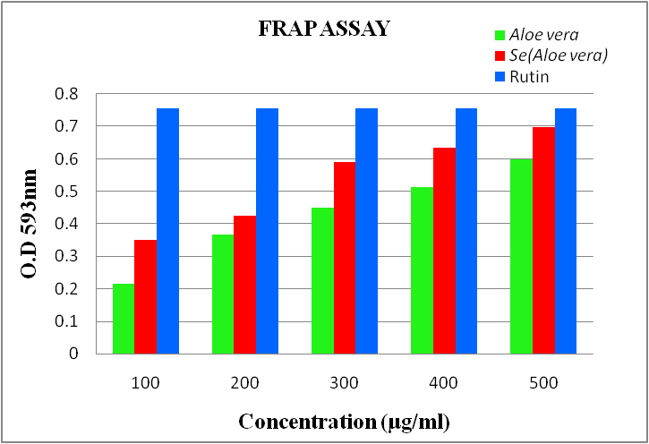 In FRAP assay the change in absorbance is directly related to the combined or “total” reducing power of the electron donating antioxidants present in the reaction mixture of Selenium nanoparticles containing Aloe vera extract. According to FRAP assay Fig.8 shows reducing activity of biogenic synthesized Selenium nanoparticles and Aloe vera extract. Selenium nanoparticles showed more reducing activity than the Aloe vera extract and the reducing activity of Selenium nanoparticles was found with increasing concentrations.
