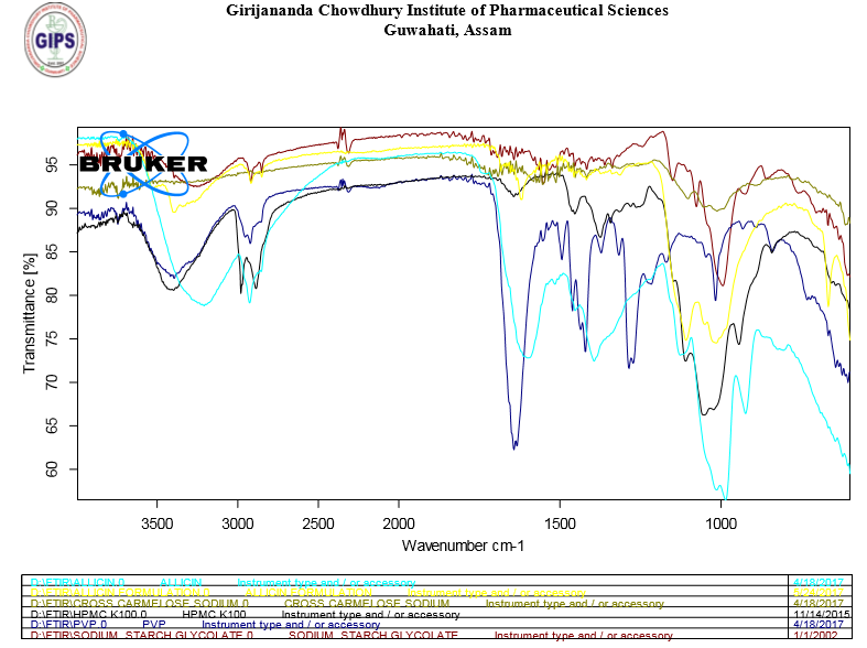 The FTIR analysis was carried out of the pure drug, excipients and the formulation to evaluate the physical stability and compatibility of the drug with the excipients. 10 mg of the sample were taken in a mortar and triturated. A small amount of the triturated sample was taken onto the sample holder and scanned from 400 cm-1 to 4000 cm-1 in FT-IR spectrophotometer (Bruker Alpha-E, modedl no-10059736). The spectra obtained were compared and interpreted for the functional group peaks.