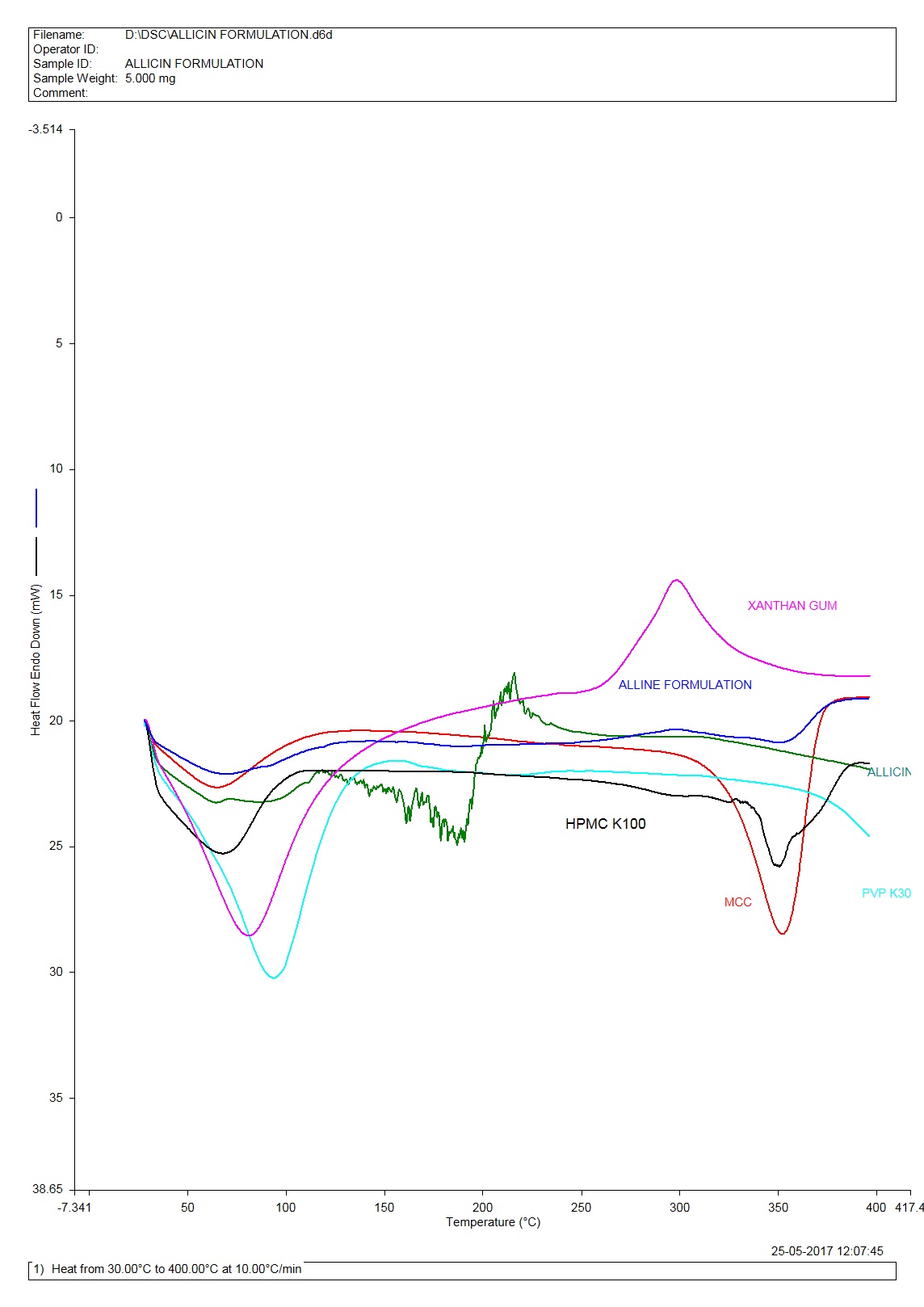 Allicin was obtained from Ayurbedic college, Guwahati, assam; Dicalcium Phosphate, Microcrystalline Cellulose, Xanthum gum, Sodium Starch Glycolate, Cross Carmellose Sodium, HPMC K 100, PVP, Magnesium Stearate, Talc were obtained from Merk Specialist pvt. Ltd., Mumbai-18. All other chemicals used were of analytical grade.