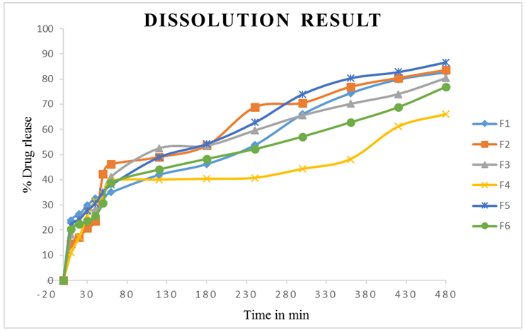 Drug release studies of formulated tablets were conducted in the USP (II) dissolution test apparatus (Lab India, DS8000) using phosphate buffer pH7.4 as dissolution medium maintained at 37. 2 ° C. The dissolution vessels were filled with 900 ml of phosphate buffer pH7.4. The vessel maintained at 50 rpm under stirring conditions by means of paddle fabricated for purpose in dissolution apparatus.