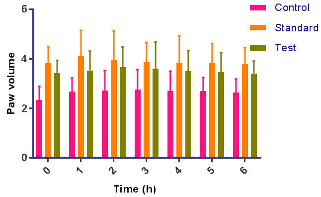 Where Ct = paw circumference at time t, Co = paw circumference before carrageenan injection, (Ct-Co) = oedema or change in paw size after time t [12-13].