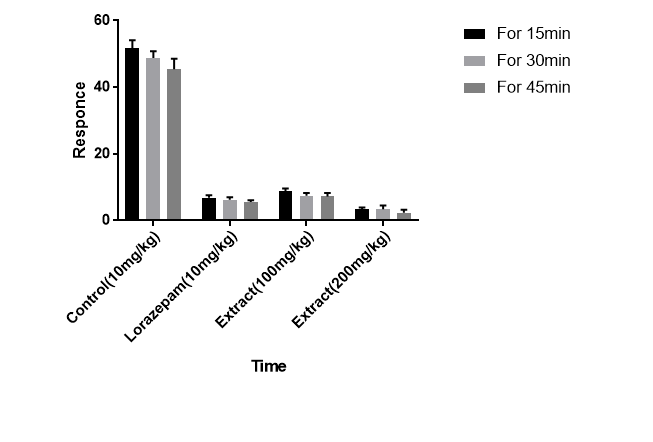 Here, Group, I served as control which received Normal saline 10 ml/kg; Group II served as a standard drug which received Lorazepam 10 mg/kg, p. o.; Group III and Group IV received the ethanolic extract of Zingiberofficinale orally at a dose of 100 and 200 mg/kg respectively.