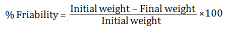 10 tablets of each batch were weighed and put into Roche friabilator and operated for 4 min at 25 rpm. The tablets were recovered and freed from dust and weighed. Friability was calculated from the following formula:
