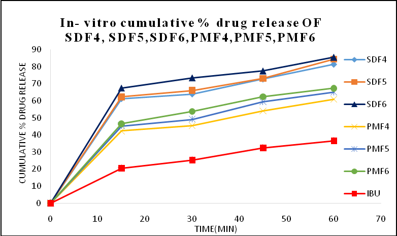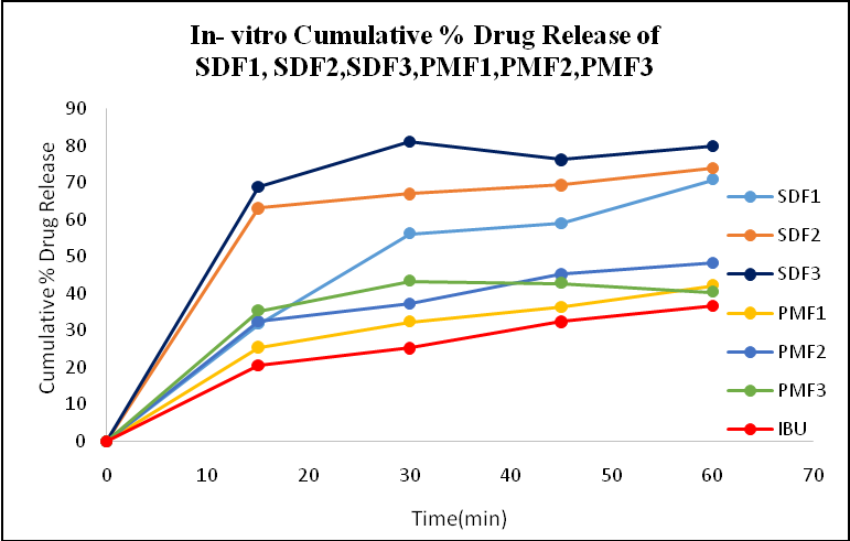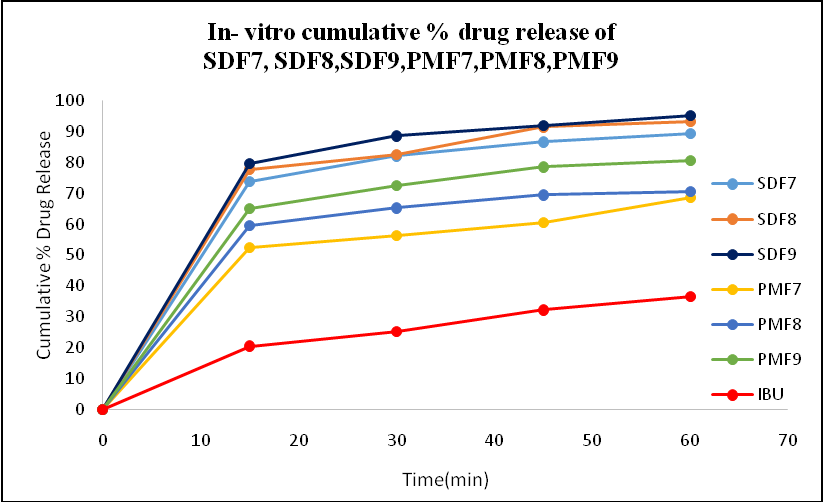 All the solid dispersions showed a better release profile as compared to the drug and physical mixtures. Solid dispersions of ibuprofen SDF7 (1:1:1), SDF8 (1:2:2) and SDF9 (1:3:3) prepared by using a combination of PEG 20000 and Poloxamer 407 by solvent evaporation technique showed faster and better drug release as compared to other formulations and physical mixtures. Formulations SDF7 (1:1:1) and SDF8 (1:2:2) showed a good drug release of 89.24% and 93.17% respectively in 60 min. Formulation SDF9 (1:3:3) showed a release of 95.09% in 60 min, which was the best among all the prepared solid dispersions and thus considered as the optimised batch.