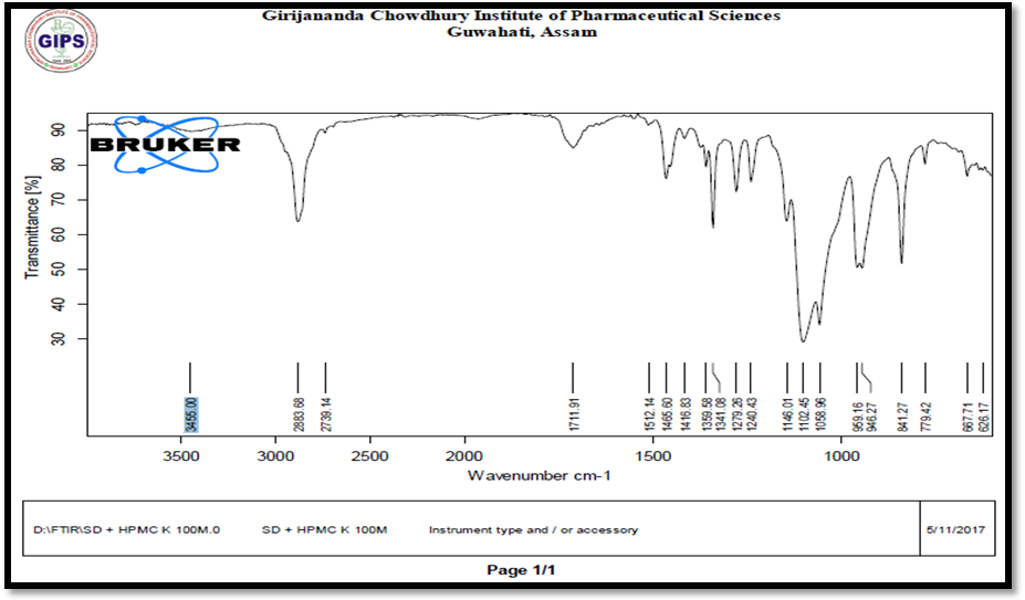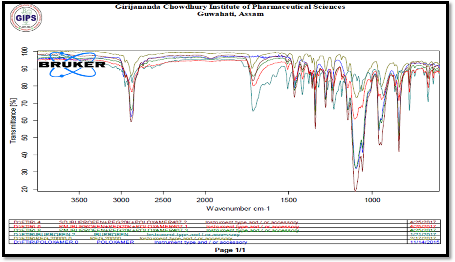 The FT-IR study was performed for the drug ibuprofen, PEG 20000, poloxamer 407 and selected solid dispersion formulations-SDF7, SDF8, SDF9. Another FT-IR study was performed for the physical mixture of SDF9 and HPMC K100M to assess the drug-excipient compatibility before the formulation of sustained release tablets. A small amount of each sample was taken in a mortar and triturated. The triturated sample was taken in the sample chamber of the instrument and scanned from 400 cm-1 to 4000 cm-1 in Bruker FT-IR spectrophotometer. The spectra obtained were compared and interpreted for the functional group peaks.