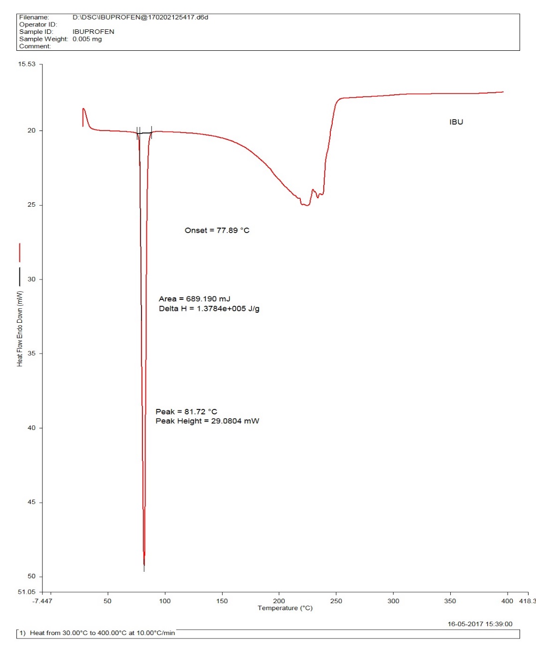 The DSC thermogram of pure ibuprofen showed a sharp endothermic peak at 81.72 °C which corresponds to its melting point. The DSC thermogram of Ibuprofen-PEG 20000-Poloxmer 407 (1:3:3) solid dispersion prepared by a solvent evaporation method (SDF9) showed the endothermic peak at temperature 59.38 °C with some changes in the characteristics of the peaks. It showed that no possible interaction took place between the drug and carriers and the loss of peak sharpness indicated the conversion of a crystalline form of the drug to amorphous form.