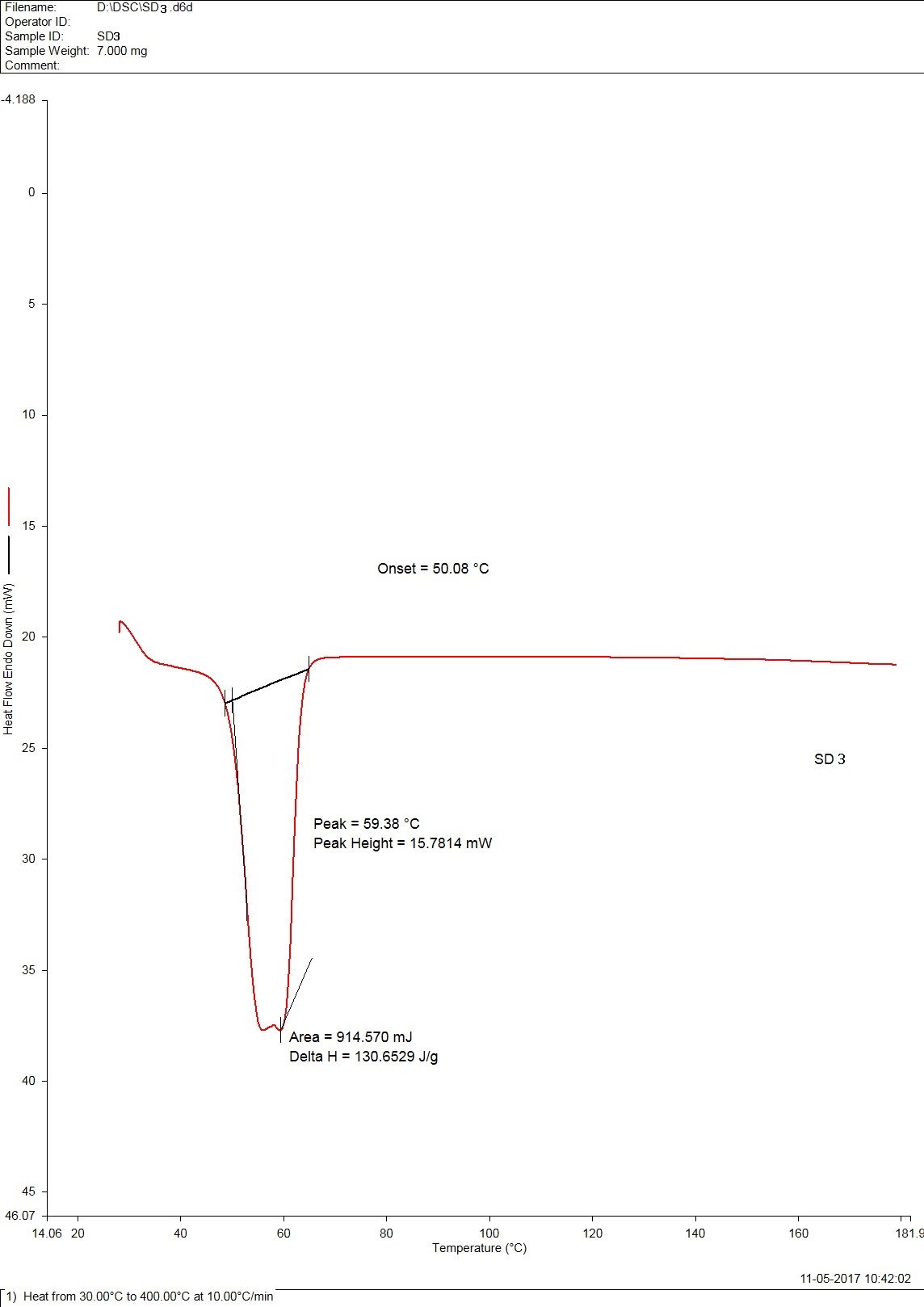 Differential scanning calorimetry (DSC) of the drug and a selected formulation SDF9 were performed using Perkin Elmer DSC 4000 for the measurement of heat loss or gain resulting from physical or chemical changes within a sample as a function of temperature. About 6-7 mg of the sample was weighed in aluminium DSC pans and hermetically sealed capsules were prepared with aluminium lids. An initial ramp was used to jump the temperature to 30 °C and then a constant heating rate of 10 °C/min was used up to 400 °C under nitrogen atmosphere.