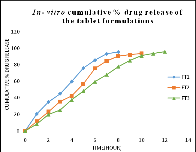 In vitro release rate of all designed formulations were studied up to 12 h. Formulations FT1 and FT2 failed to sustain the release of drug upto12 h. FT1 showed 95.58% of drug release in 8 h while FT2 showed 93.74 % of drug release in 10 h. Formulation FT3 only succeeded to allow a sustained release of drug upto12 h. At the end of 12 h the release was 96% and so it was considered as the optimised batch.