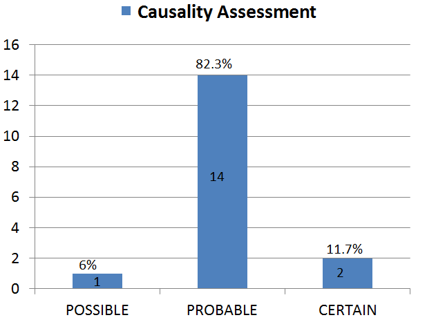 Fig. 3 shows the percentage of cases reported to be possible, probable and certain. The causality assessment revealed that most of the ADRs belonged to “probable” category (14, 82.3%) followed by “certain” category (2,11.7%).