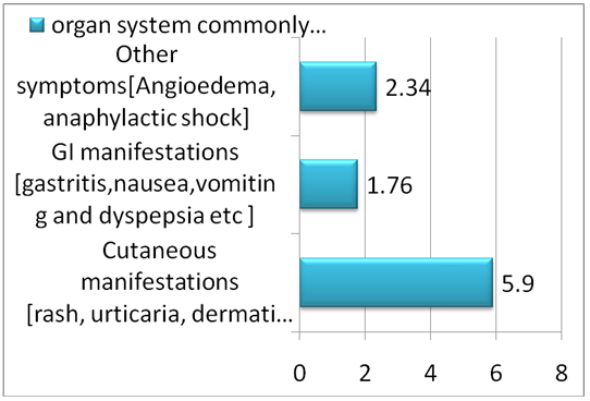 The next organ system commonly involved was a gastrointestinal system which included gastritis, nausea, vomiting and dyspepsia etc accounting for 17.6% of total ADRs. and analgesics were the most common offending agents here.