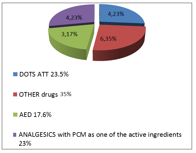 23.53% of the severe ADRs were due to DOTS-ATT specifically Rifampicin, 23% due to analgesics with paracetamol one of the active ingredients and 17.65% were due to anti epileptic agents like Phenytoin and CBZ.