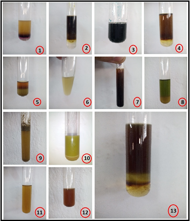 Fig. 1: Qualitative analysis of jute leaf extract, [1] Carbohydrate [ 2] Glycoside [3] Protein [4] Steroid [5] Cholesterol [6] Alkaloid [7] Phenol [8] Flavonoid [9] Saponin [10] Anthraquinone [11] Tannin [12] Phlobatannin [13] Terpenoid