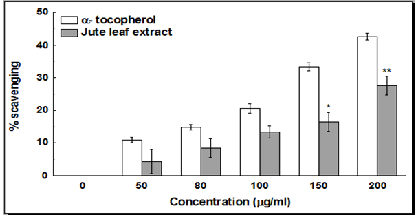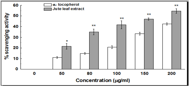 ¶Data presented as mean±SD of three independent observations, significantly less IC50 value 75.41±5.25 μg/ml was observed in methanolic extracts of senescence C. Olitorius leaf (60 DAS) in comparison to 327.35±7.10 μg/ml obtained in the methanolic extract of the standard α-tocopherol. IC50 values of mature and immature leaf extract were recorded as 159.57±14.55 and 633.26±46.36 respectively.