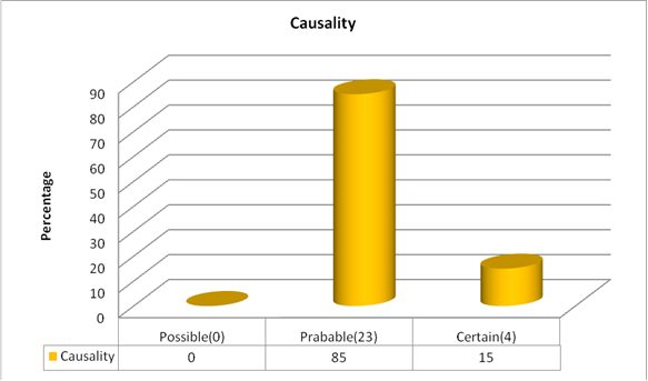 The present study is carried out at Bhaskar General HospitalAdverse drug reactionsmonitoring centre after obtaining permission from Pharmacovigilance committee members and ethicscommittee. No financial implications are seen. The study is done for a period of 6 mo, it is aprospective observational study wherein adverse drug reactions were collected through notification form (yellow form) and CDSCO form (red form), and further evaluated for irrational prescriptions. Hartwig and Seigelscale do severity assessment of the adverse drug reaction. Causality assessment is done by WHO-UMC causality assessment scale. Rationality was assessed using National List of Essential Medicines of India (NLEM) 2015[2].