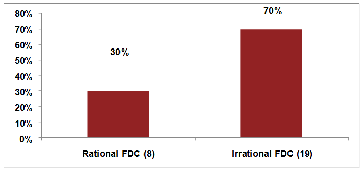The World Health Organization (WHO) defines fixed Dose Combinations (FDCs) as combination of two or more active ingredients in a fixed ratio of doses [1]. Polypharmacy is the commonest mode of prescription for single or multiple ailments. Irrational FDC are a part of polypharmacy, which need to be curbed. It is need of the hour to adopt essential medical list and preferred drugs to improve rational therapeutics. The estimated number of FDCs in India is over 6000 and financial turnover associated with it is Rs 7000 crores. Whereas only 24 FDCs out of 376 entities in the National List of Essential Medicines of India (NLEM) 2015 [2] are considered to be rational. Recently health ministry banned 344 fixed-dose combination drugs [3] in March due to questionable efficacy, safety, and rationality. But pharma companies obtained a judicial stay on the order. So the present study was conducted to evaluate irrational fixed dose combinations.