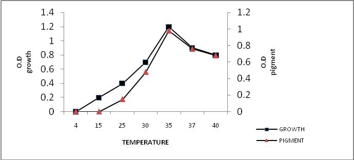 In this optimization study 4, 15, 25, 30, 37 and 40 °C was the temperatures selected. There was less fluorescent pigment production was observedat 25 °C, 30 °C. 40 °C and 37 °C respectively and no pigment production were observed when incubated at 40 °C and 15 °C. The maximum O. D (0.98) was observed when incubated at 35 °C, and the maximum cell density was observed for 35 °C and no growth was observed at 40 °C (fig. 3).