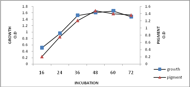 Optimization of fluorescent Pigment production was initiated by incubating the selected strain at different time durations of 12 h equal intervals. The selected isolate showed maximum growth 1.71 at 72 h and less 0.51 at 12 h. Maximum fluorescent Pigment production 1.48 at 48 h and less 0.21 at 12 h showing that, further increase in temperature reduces the pigment production (fig. 4)