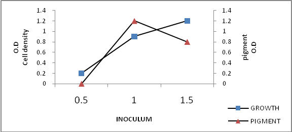 An investigation for further increase in growth and fluorescent Pigment production, the effect of various inoculum sizes was studied. To evaluate the effect of inoculum size, varied cell concentrations (0.5, 1.0 and 1.5%) were added to separate flasks and then carried out as described in materials and methods. Growth and fl. Pigment production varied with inoculum level and showed a parabolic nature in the studied range (fig. 3). The maximum growth was at 1.5% inoculum, and fluorescent Pigment production was maximum at 1.0% and further decreased in increased inoculum concentration fig. 5.