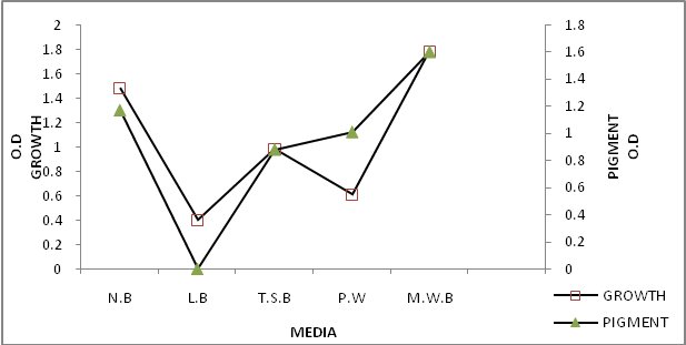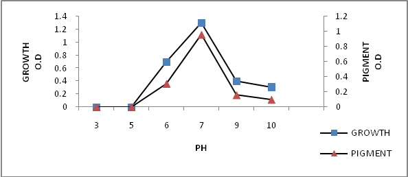 Selected potential bacterial strain were subjected to various concentrations of pH ranging from 3.0 to 10.0 were taken for the study of an interval of pH 1.0. Maximum growth at 1.30 at ph 7.0 and decreased further increases the pH beyond 7.0. No growth was registered at ph range of 4–5. Maximum pigment 0.96 and reduced further increases the pH beyond 7.0. No pigment was recorded at ph range of 4-5. fig. 6