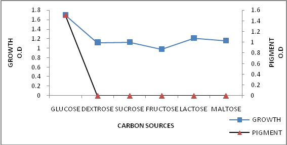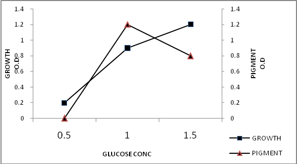 Glucose concentration of 1.5% was optimum for cell growth and optimum pigmentation 1.2 is at the concentration of 1.0%. [fig. 8]. Glucose, usually an excellent carbon source for growth, interferes with the synthesis of many secondary metabolites. Because of parallels with the well-known suppression by glucose of catabolic enzymes that use less-preferred substrate, this has been referred to as ‘catabolite repression’. In many secondary metabolite pathways, the enzymes subject to control by the carbon source are known.