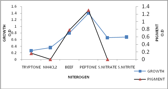Different carbon sources such as glucose, dextrose, sucrose, fructose, lactose and maltose were supplemented in the nutrient broth and inoculated with the isolate and were incubated at 35 °C for 48hr. Different nitrogen sources such as Tryptone, beef extract ammonium chloride, peptone, sodium nitrate and sodium nitrite were supplemented separately to a final concentration of 0.1% (w/v) in nutrient broth. Different amino acids such as cysteine, leucine, methionine, tryptophan, histidine, glutamine and proline (0.5%, final concentration) were dissolved in the nutrient broth. Effect of carbon source, nitrogen source and amino acids ongrowth and pigment production was measured 450 nm.