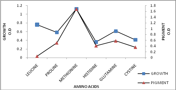 In order to examine the effect of different amino acids sources, leucine, proline, methionine, histidine, glutamine and cysteine were tested. Maximum growth 1.12 at 0.5% methionine and less 0.41 at 0.5% cysteine. Maximum pigment 1.60 at 0.5% methionine and less cysteine 0.36 was registered. (fig. 10).