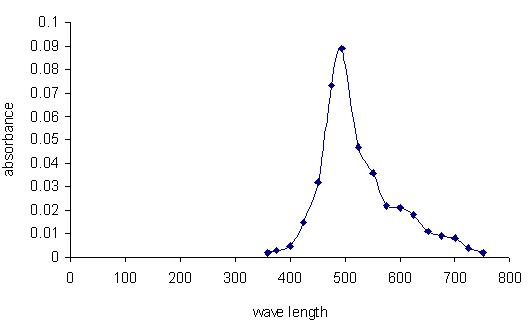 Fig. 12B: Absorption spectra of purified fluorescent pigment1OFP of AVP9 from 350 nm to 760 nm showing absorption maxima at 493 nm