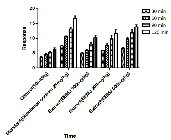 A pharmacological screening test for Mirabilis jalapa was performed to check the analgesic activity of the plant. The ethanolic extract of Mirabilis jalapa leaf (EEMJ) significantly increase the reaction time at different doses. 10 ml/kg saline water was served to each animals in control(Group I), and it is taken as the reference to make a comparision between the extracts of different concentration at different time intervals at 30 min, 60 min, 90 min and 120 min. All the drugs were administered orally. First group serves as control (Saline water 10 ml/kg), second group of animals served as standard control (Standard Drug: 25 mg/kg Diclofenac sodium), while group 3, 4 and 5 received extracts (EEMJ) 100 mg/kg, 200 mg/kg and 500 mg/kg respectively. At 30 min, 60 min, 90 min and 120 min there is a significant increase in the reaction time in both standards and all doses of the extracts as shown in the fig. 2 respectively. The highest response is shown by the standard drug and among the extracts, the highest response is seen in case of the extract 500 mg/kg. The hot plate method as described by Eddy and Leimback (1953) is the most common thermal nociception model used for evaluating the central analgesic efficacy of drugs or compounds. This method can be considered to be selective for the centrally acting analgesics, that they could have centrally acting analgesic property and the Ethanolic extract of leaves of Mirabilis jalapa plant gives a positive test. It is observed that at 500 mg/kg the reaction time is increased the most according to time and dose dependent manner. Therefore increase in the reaction time indicates that the ethanolic extract of leaves of Mirabilis jalapa shows significant analgesic activity by comparing with the control group.