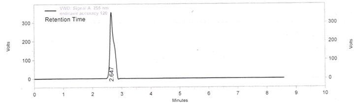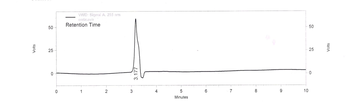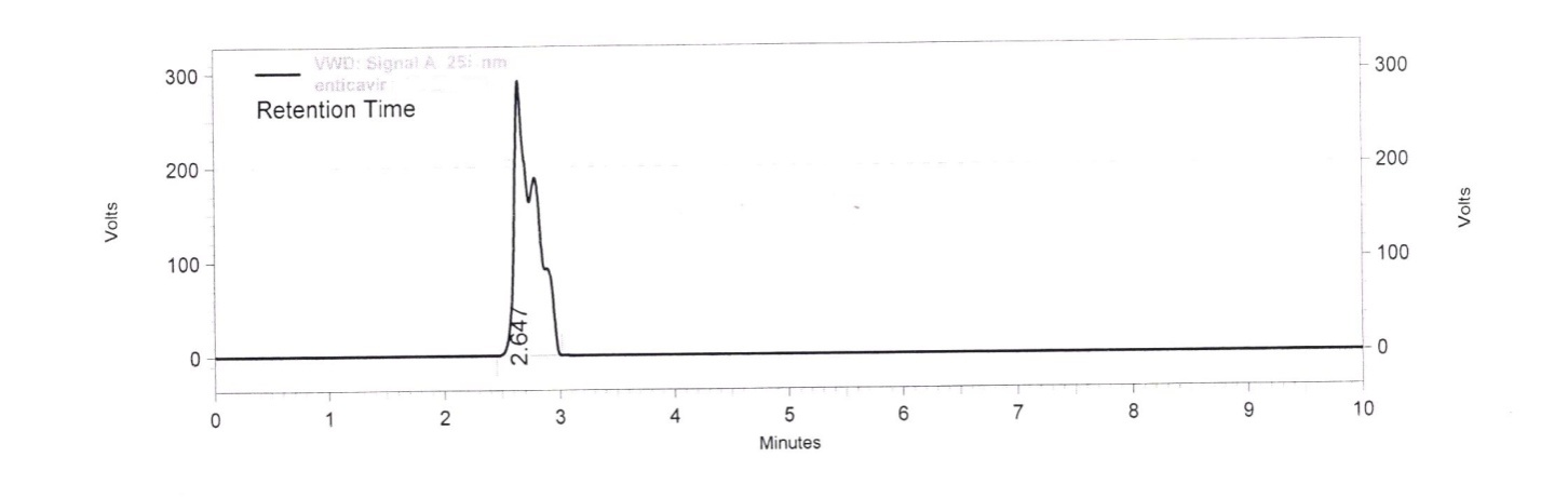 The retention time for Entecavir was found to be 2.6 min. The low % RSD values (≤ 2) indicated that the method was precise and accurate. Specificity of the chromatographic method was tested by injecting sample concentration prepared from the marketed formulation. The response was compared with that obtained from the standard drug. The chromatogram confirms the presence of Entecavir at 2.6 min without any interference.