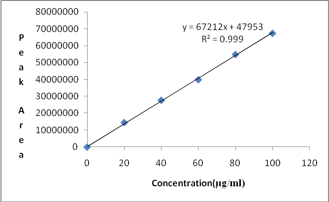 Linearity was determined by taking the concentrations of 20, 40, 60, 80 and 100µg/ml from the standard stock solution. A calibration curve was plotted by taking peak area vs concentration.