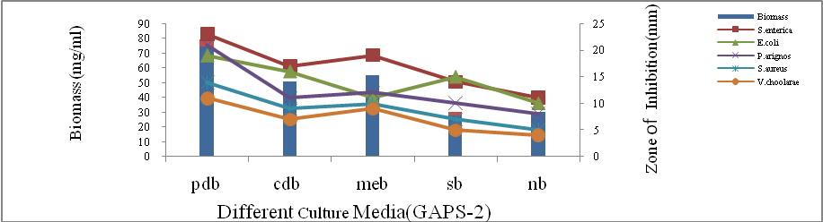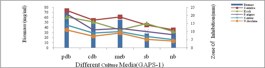 Effect of Culture media on Secondary metabolite production and biomass by gaps-1, gaps-2 showing maximum growth and antibiotic production in Potato dextrose broth comparatively to other media. Fig. 1 Reveals that the effect of different growth media on biomass and bioactive metabolite production of inoculated gaps-1 and gaps-2 within 6 d of incubation (on orbital shaker incubator). According to fig. 1 among the tested media, maximum mycelial dry weight and bioactive metabolite production was recorded in potato dextrose broth medium.