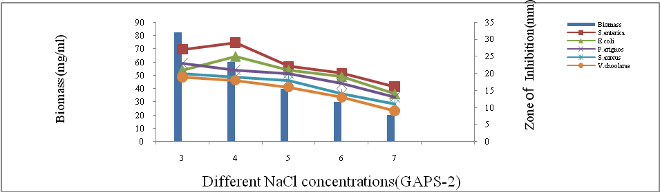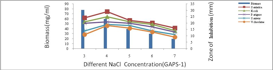 Effect of Culture media on Secondary metabolite production and biomass by gaps-1, gaps-2 showing maximum growth and antibiotic production in Potato dextrose broth comparatively to other media. Fig. 2 Reveals that the effect of Nacl on Secondary metabolite production and biomass by gaps-1 and gaps-2showing maximum growth and antibiotic production in pdb at Nacl 3% with agitation 150 rpm.