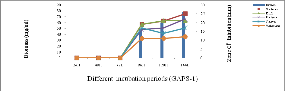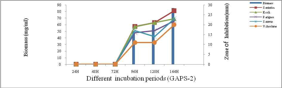 Effect of incubation time period on Secondary metabolite production and biomass by GAPS 1 and 2 showing maximum growth and antibiotic production in pdb at Nacl 3% with incubation time 144 h