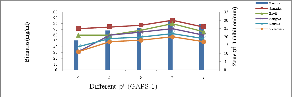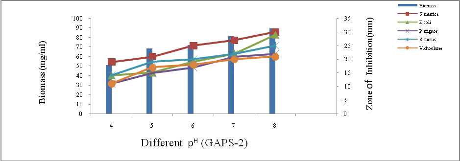 Fig. 4 explains about effect of PH on Secondary metabolite production and biomass by gaps 1 and 2 showing maximum growth and antibiotic production in pdb at Nacl 3%; incubation time 144 h; PH-7(GAPS-1), 8(GAPS-2). Selected potential marin fungal metabolite were subjected to various concentrations of pH ranging from 3.0 to 10.0 were taken for the study of an interval of pH 1.0. Maximum growth at ph 7.0 (gaps 1) ph 8.0 (gaps-2) and decreased further increases the pH beyond 7.0. No growth was registered at ph range below 4.