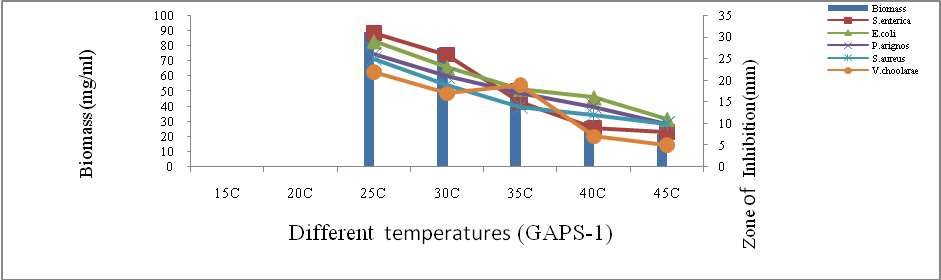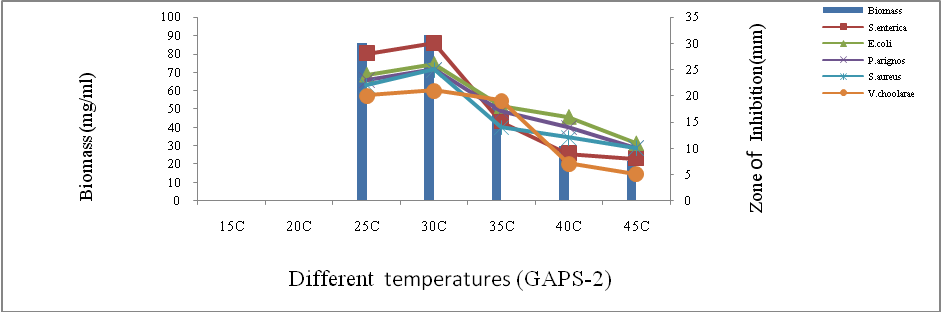 From fig. 5 effect of Temperature on Secondary metabolite production and biomass by gaps-1, gaps-2 showing maximum growth and antibiotic production in PDB at Nacl 3%; incubation time 144 h; PH-7(GAPS-1), 8(GAPS-2); temperature-25 °C(GAPS-1), 30 °C(GAPS-2) The requirements for specific physical temperature (250c and 30 °c).