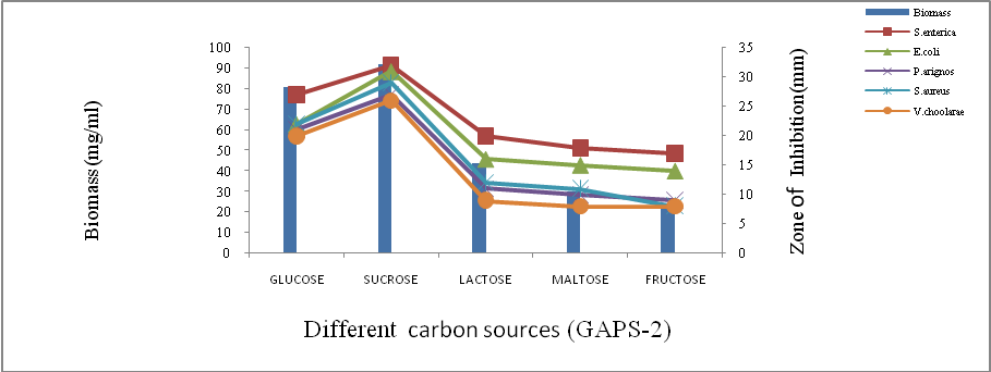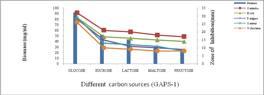 Effect of carbon sources on Secondary metabolite production and biomass by gaps-1,gaps-2 showing maximum growth and antibiotic production in pdb at Nacl 3%; incubation time 144 h; PH-7(GAPS-1), 8(GAPS-2); temperature-25 °C (GAPS-1), 30 °C (GAPS-2). 1% of carbon sources: Glucose (GAPS-1), sucrose (GAPS-2). From fig. 6 of all the tested carbon sources (1% w/v) in the selected medium inoculated with gaps-1 and gaps-2 incubated shaken for 6 d, glucose and sucrose supported the highest level of mycelia growth and bioactive metabolite production.