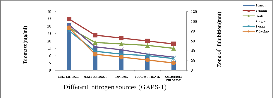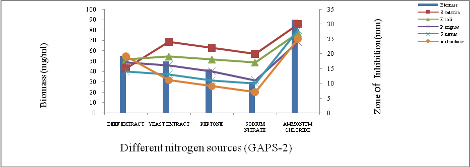 According to fig. 7 effect of nitrogen sources on Secondary metabolite production and biomass by GAPS-1and2showing maximum growth and antibiotic production in pdb at Nacl 3%; incubation time 144 h; PH-7(GAPS-1), 8(GAPS-2); temperature-25 °C (GAPS-1), 30 °C (GAPS-2), 1% of carbon sources: Glucose(GAPS-1), sucrose (GAPS-2); 1% of nitrogen sources: Beef extract(GAPS-1), Ammonium chloride(GAPS-2) Addition of equimolar amounts of various nitrogen sources in the selected medium supplemented with 1.0% (w/v) show that beef extract and ammonium sulphate were good nitrogen sources on the mycelia growth and bioactive metabolite production.