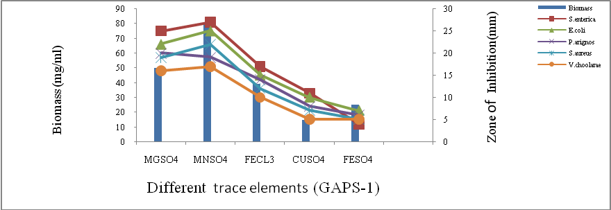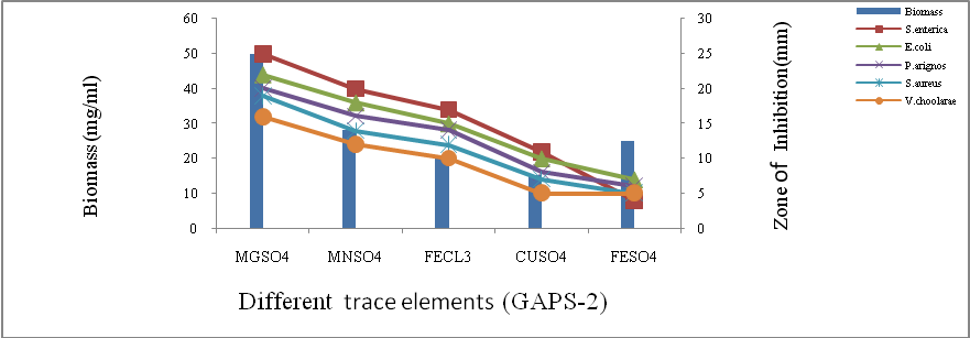 Fig. 8 shows the effect of trace elements on Secondary metabolite production and biomass by gaps-1, gaps-2 showing maximum growth and antibiotic production in pdb at Nacl 3%; incubation time 144 h; PH-7(GAPS-1), 8(GAPS-2); temperature-25 °C (GAPS-1), 30 °C(GAPS-2) 1% of carbon sources: Glucose(GAPS-1), sucrose (GAPS-2); 1% of nitrogen sources: Beef extract (GAPS-1), Ammonium chloride(GAPS-2) but trace elements shown the effect on growth and antibiotic production by reducing the activity of gaps-1, gaps-2.