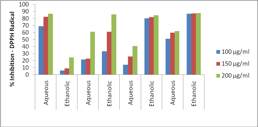This method is based on scavenging of the DPPH radical from the antioxidants, which produces a decrease in absorbance at 517 nm. syzygium cumini leaves aqueous showed highest DPPH scavenging activity with 87.13% inhibition in the dose concentration of 200µg/ml followed by syzygium cumini bark ethanolic extract with 86.03%. (fig. 1)
