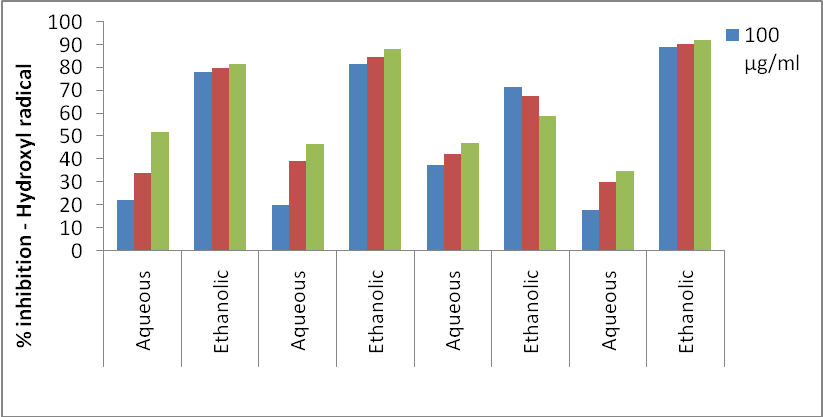 The ability of the ethanolic extract of Syzygium cumini to quench hydroxyl radicals seems to be directly related to the prevention of propagation of the process of lipid peroxidation and seems to be a good scavenger of active oxygen species. Syzygium cumini bark ethanolic showed highest hydroxyl scavenging activity with 88.13% inhibition in 200µg/ml concentration followed by Syzygium cumini bark ethanolic extract with 84.56% and minimum activity showed by bark aqueous with 19.88% (fig. 2).