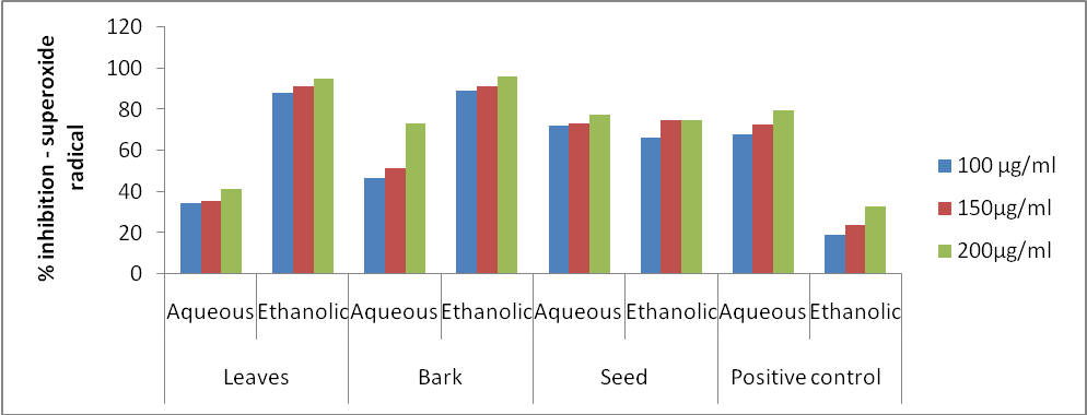 Superoxide anion plays an important role in the formation of other reactive oxygen species such as hydrogen peroxide, hydroxyl radical, and singlet oxygen, which induce oxidative damage in lipids, proteins, and DNA [30]. It was reported that the superoxide anion scavenging activity could be due to the action of a free hydroxyl group of phenolic compounds were generated by the hypoxanthine-xanthine oxidase and the NBT system. Our data demonstrated that the leaves ethanolic showed highest Superoxide scavenging activity with 94.80% inhibition in 200µg/ml concentration