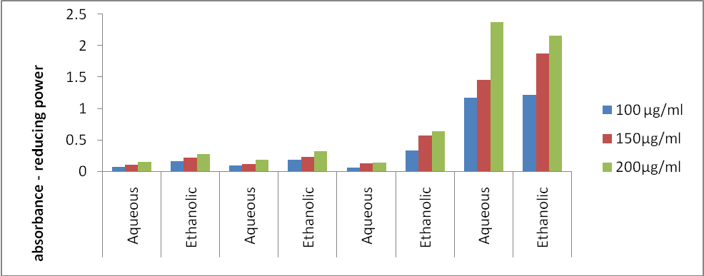 A reducing power is an indicative of reducing agent having the availability of atoms which can donate an electron and react with free radicals and then convert them into more stable metabolites and terminate the radical chain reaction [29]. Accordingly, Syzygium cumini might contain a sizable amount of reductants which may react with the free radicals to stabilize and terminate from free radical chain reaction. The reducing potential of the bark, leaves and seed extracts measured for the concentration at 100 mg/ml, 150 mg/ml and 200 mg/ml, showed a general increase in activity when concentration increased.