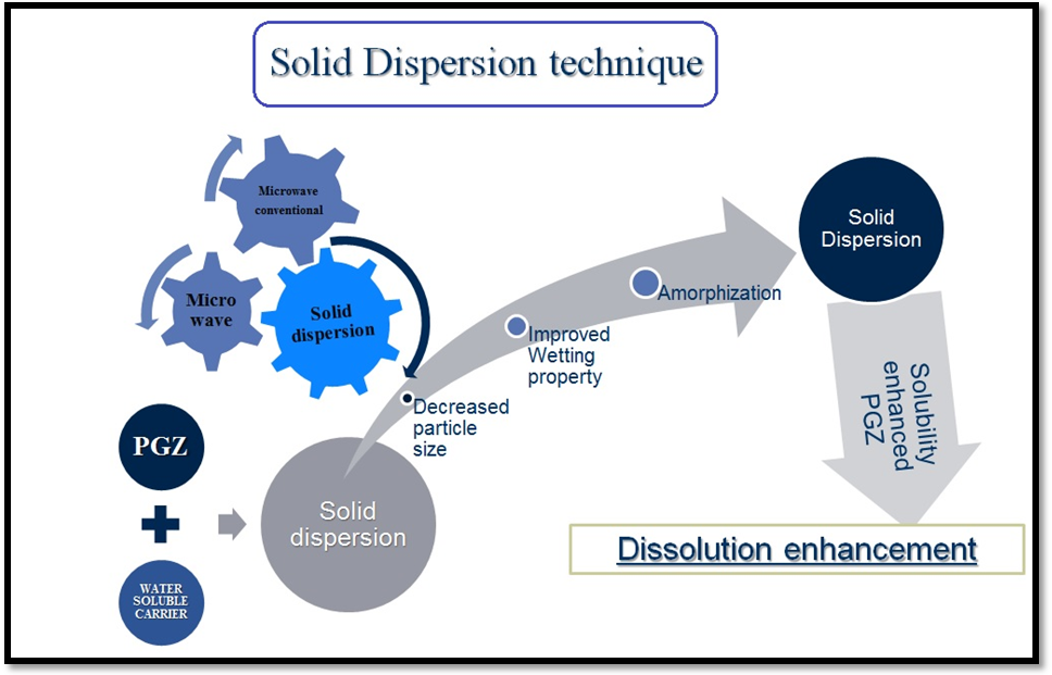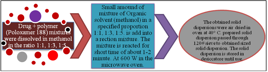 The mixture is reacted for short time of about 1-2 minute. At 600 W in the microwave oven. The obtained solid dispersions were air dried in an oven at 40 ° C. prepared solid dispersion passed through 120# sieve to obtained sized solid dispersion. The solid dispersion is stored in desiccatore until use. Then placed at room temperature for solidification. Solid dispersions were collected and stored in the desiccators for 24 hr and then the product was pulverized using a mortar and pestle. The pulverized powders were passed through an 80# sieve.